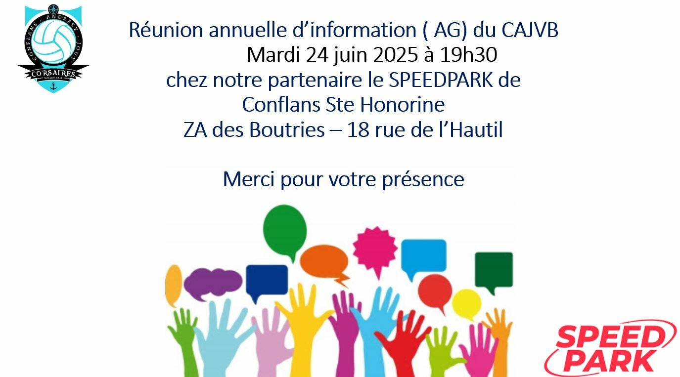 La prochaine Assemblée annuelle du CAJVB se tiendra lundi 24 juin à 19h30 dans les locaux du Speedpark à Conflans-Sainte-Honorine.